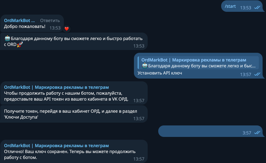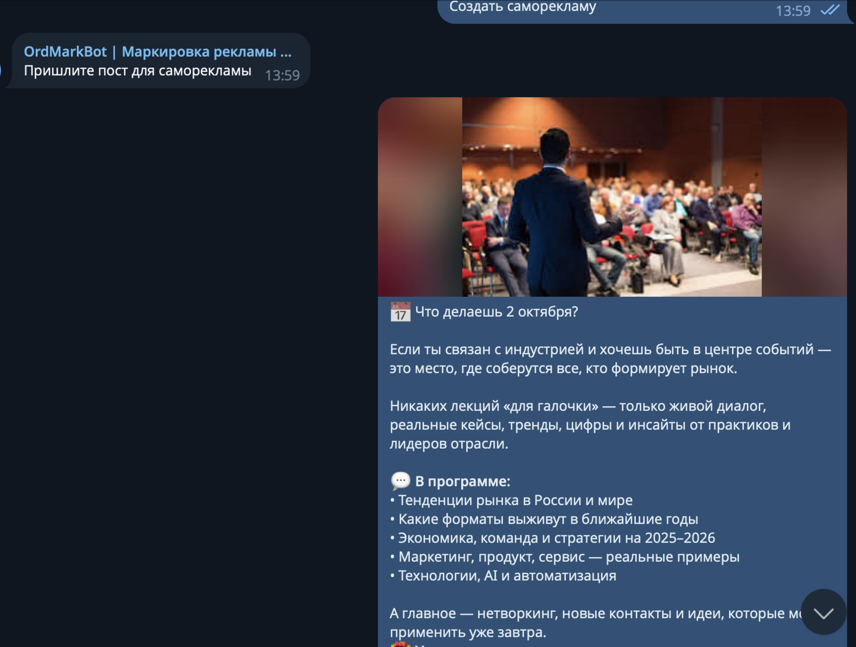 2. Отправка поста для маркировкиБот попросит прислать пост, который вы хотите промаркировать.